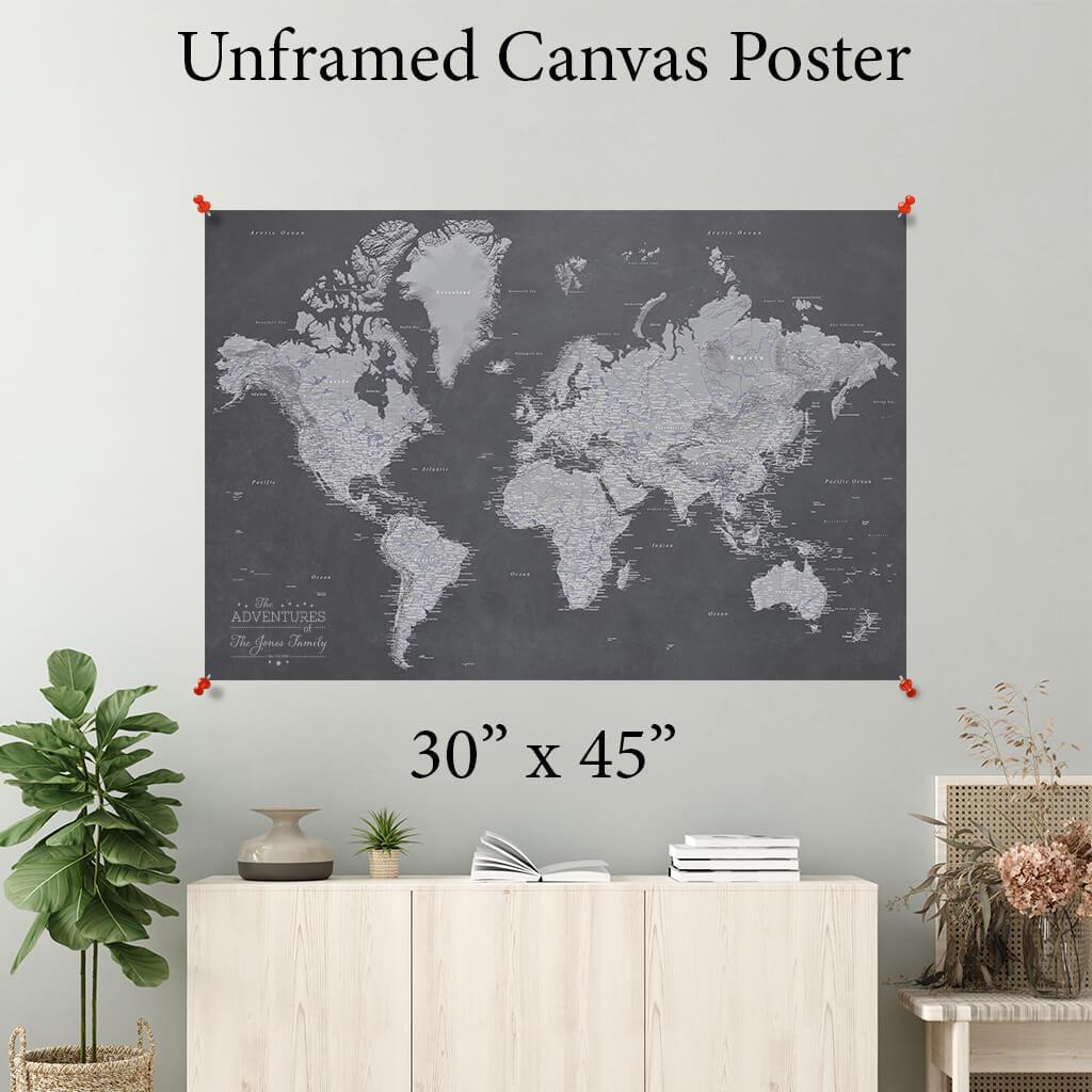 Canvas World Map Poster | Monochromatic Map | Push Pin Travel Map